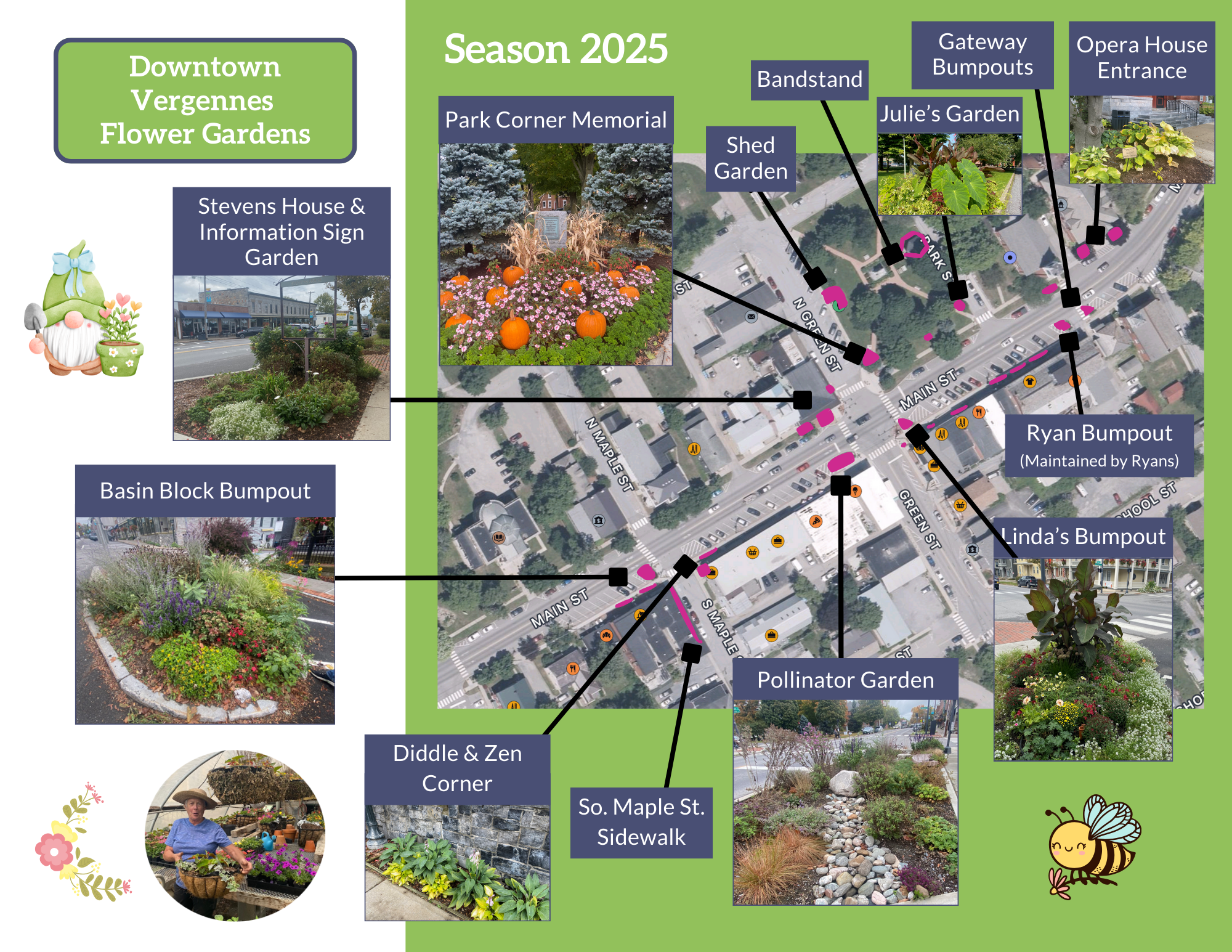 The Partnership designs, plants, and maintains numerous flower gardens and almost 50 hanging baskets and planters throughout downtown and along the Otter Creek Bridge. The map below outlines the full scope of our planting areas. The Vergennes Partnership Flower Fund covers essential expenses—planters, plants, soil, seeds, nutrients, mulch—while our volunteers contribute ALL the design expertise and labor.