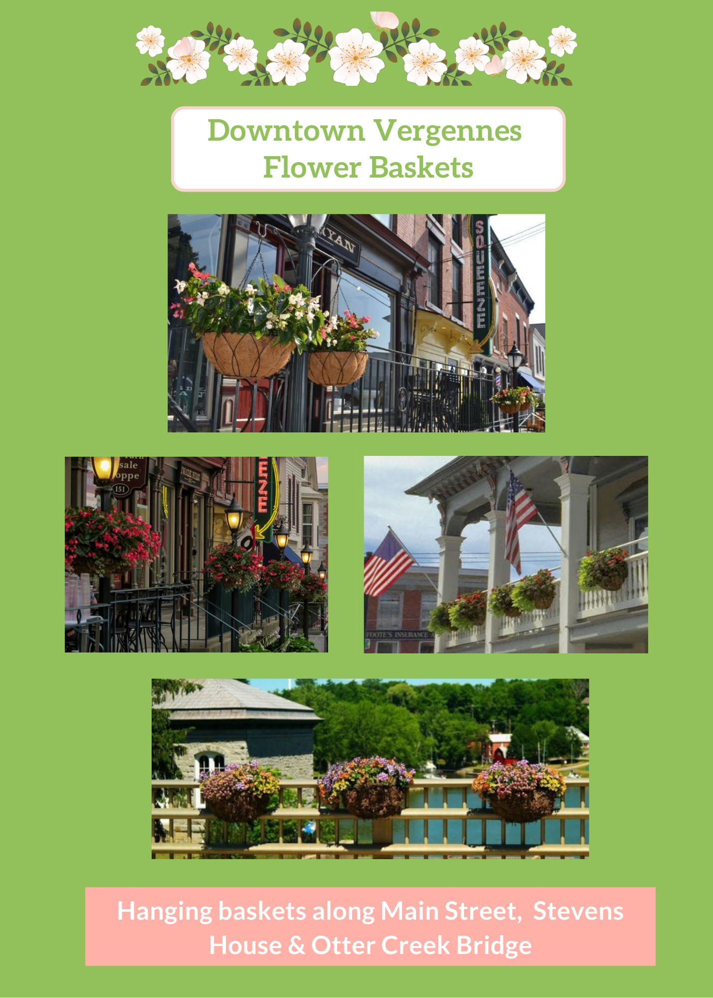 18 hanging flower planters along the Otter Creek Bridge